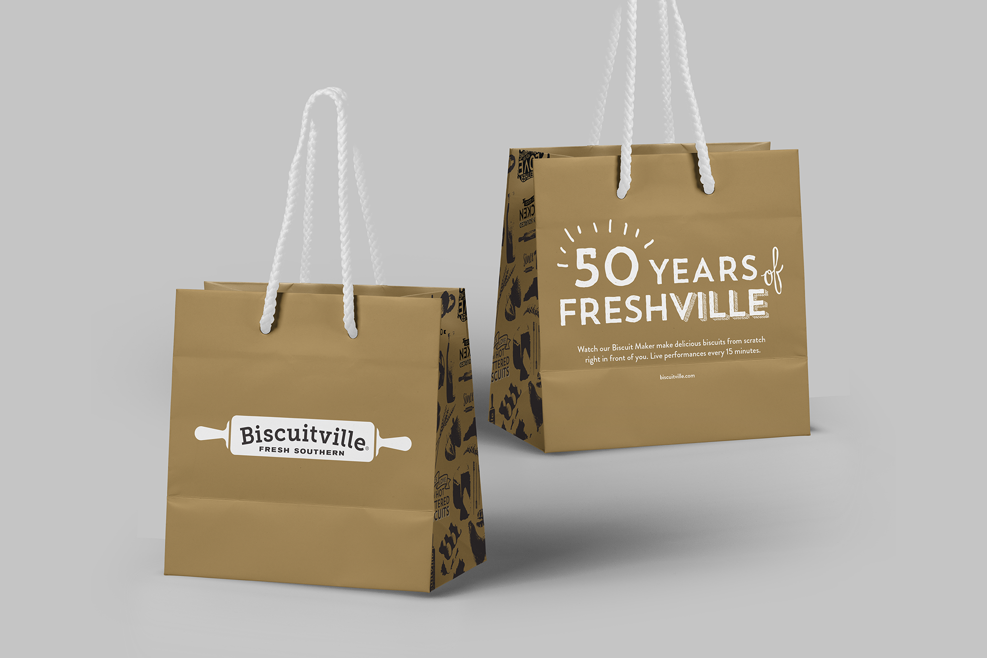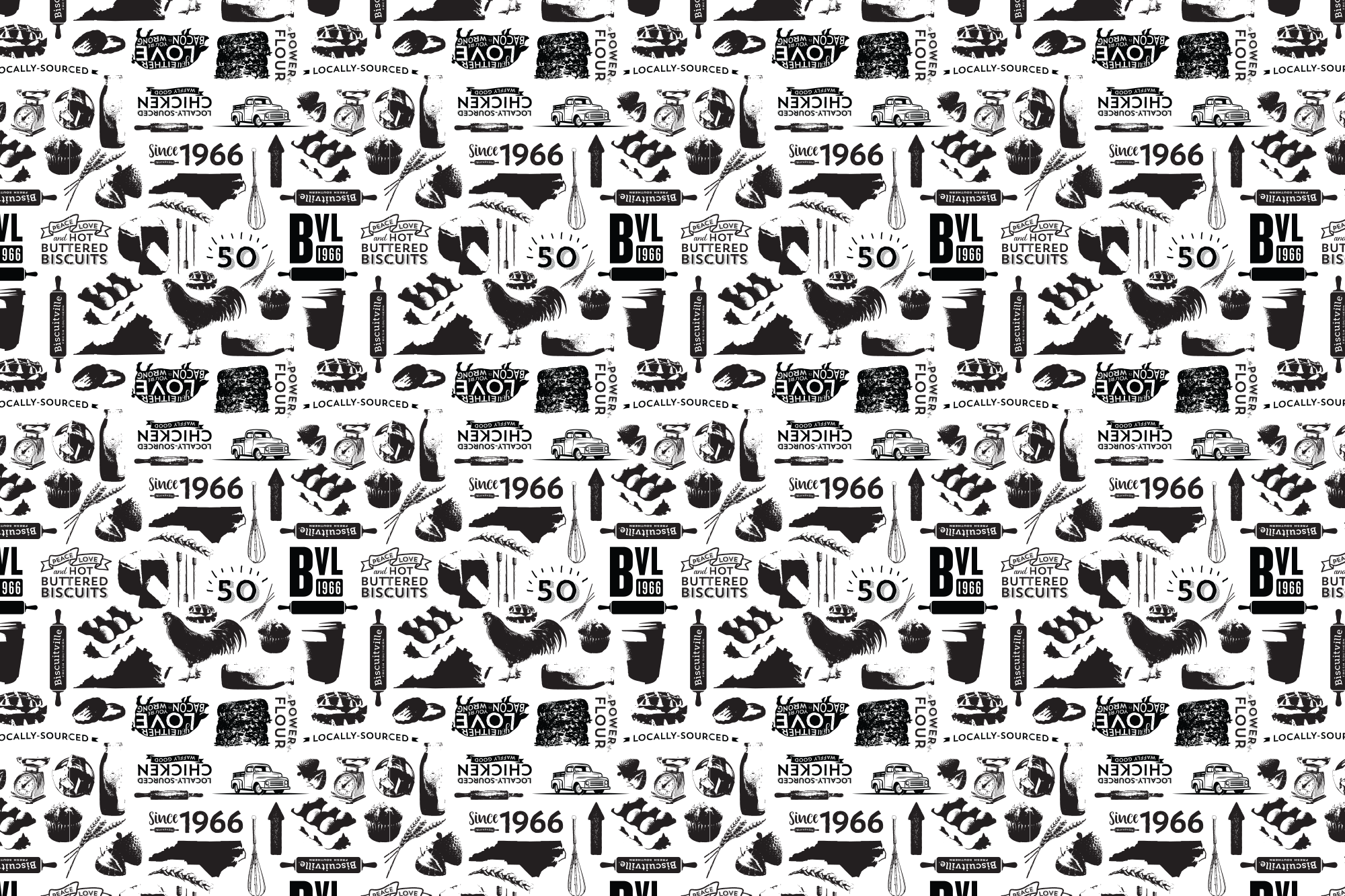 Biscuitville specializes in delicious southern-style biscuits, which are the foundation of the menu, so it only made sense to use the biscuit imagery as the foundation of the packaging design and pattern. The pattern created for the packaging also incorporates imagery from the most important elements of the brand in an illustrative style eliciting a sense of hand-touched care. These brand elements include the state shape of Virginia, the original location of Biscuitville, locally sourced ingredients and kitchen tools.